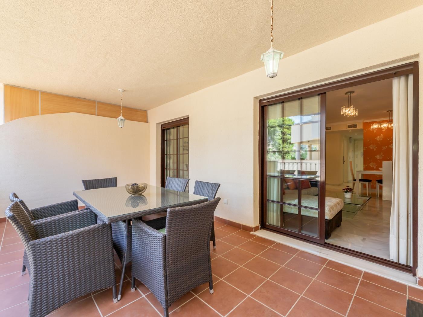 Tiene un salón de gran tamaño que comunica con la terraza que mira hacia Norte. Las zonas comunes de la comunidad brindan grandes espacios, seguridad y comodidad para todas las familias que visiten la vivienda.