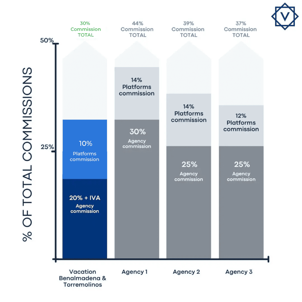 Our total commission, which includes 10% for online bookings and 20% for complete management, stands at 30%, significantly lower than other platforms and agencies on the market.